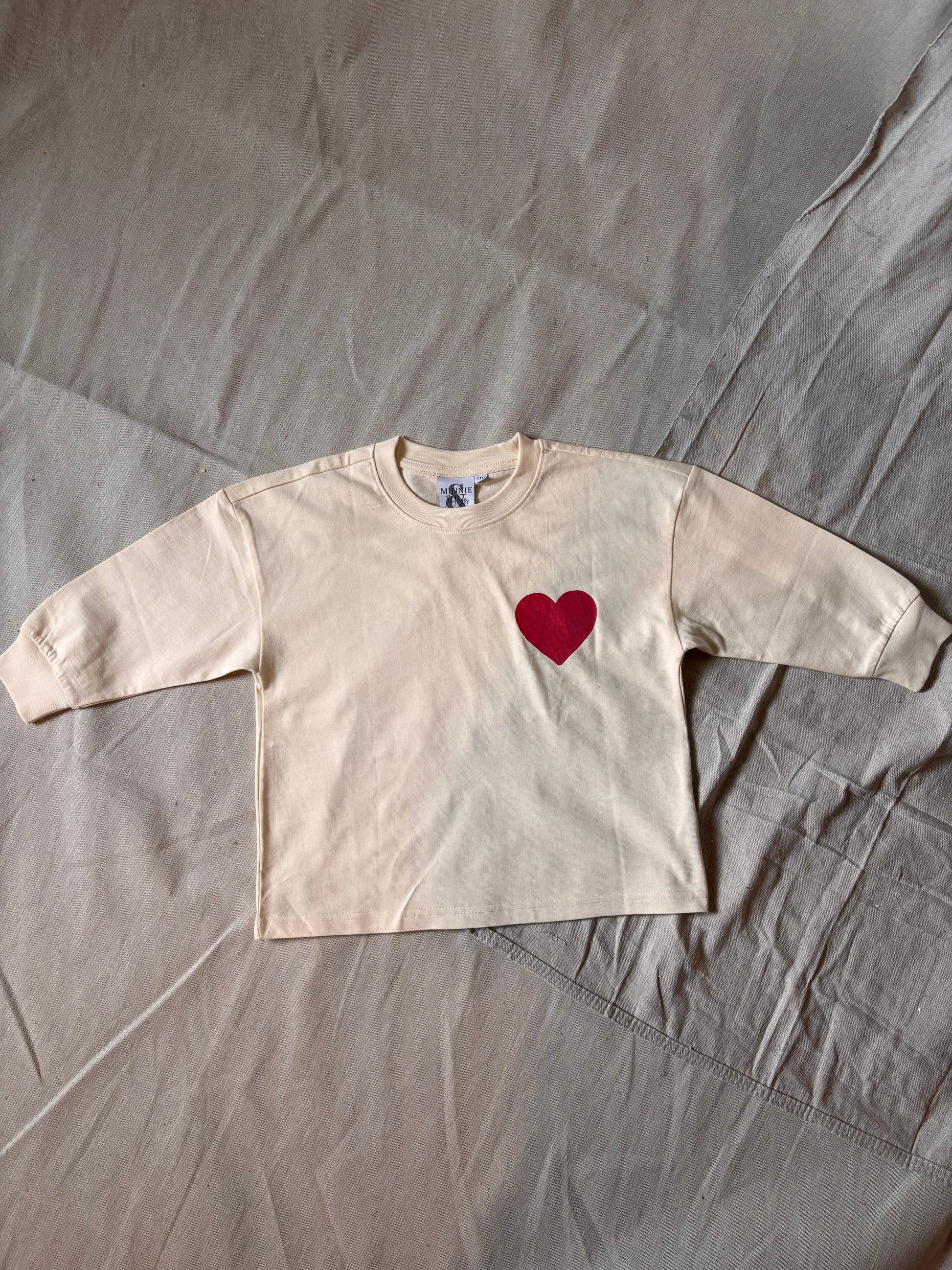 The Love Like a Poet long sleeve is part of our very first production run — the earliest chapter in the Minnie & the Higgs story. Each piece features a bold red heart on the front and the words LOVE LIKE A POET on the back, printed using two different methods that give it a raw, artist-studio feel.